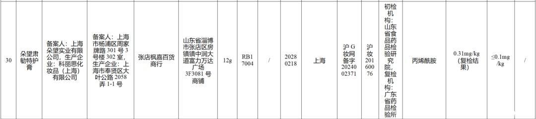 抽检结果显示,1批次标称上海朵望实业有限公司备案的、科丽思化妆品(上海)有限公司生产的“朵望肃勄特护膏”检出了“丙烯酰胺”。